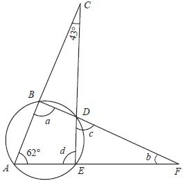 In the given figure (not drawn to scale), ∠BCD = 43° and ∠BAE = 62°, then the values of a, b, c and d respectively are A105°, 13°, 62°, 75° B100°, 10°, 60°, 75° C105°, 13°, 60°, 80° D105°, 15°, 62°, 75°