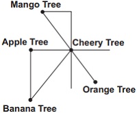 Study the given diagram to answer the question given below. Which of the following tree is in South-East of Cherry Tree? A Orange tree B Banana tree C Apple tree D Mango tree