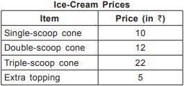 The given table shows the prices for ice-cream cones at an ice-cream store. Varun orders 9 ice-cream cones : 3 single-scoop cones with extra toppings, 2 double-scoop cones with extra toppings and 4 triple-scoop cones without topping. How much change should Varun receive if he gives ₹ 200? A ₹ 18 B ₹ 32 C ₹ 33 D ₹ 40