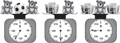 The figure shows the weight of different groups of objects. What is the total weight of a ball, a teddy, and a gift box? A 137 g B 147 g C 150 g D117 g