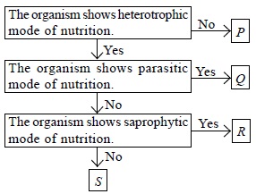Refer to the given flow chart and select the option that correctly identifies organisms P, Q, R and S.