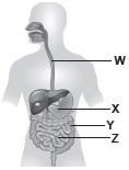 | A | Stomach | Bile | Enzymes | Large intestine |